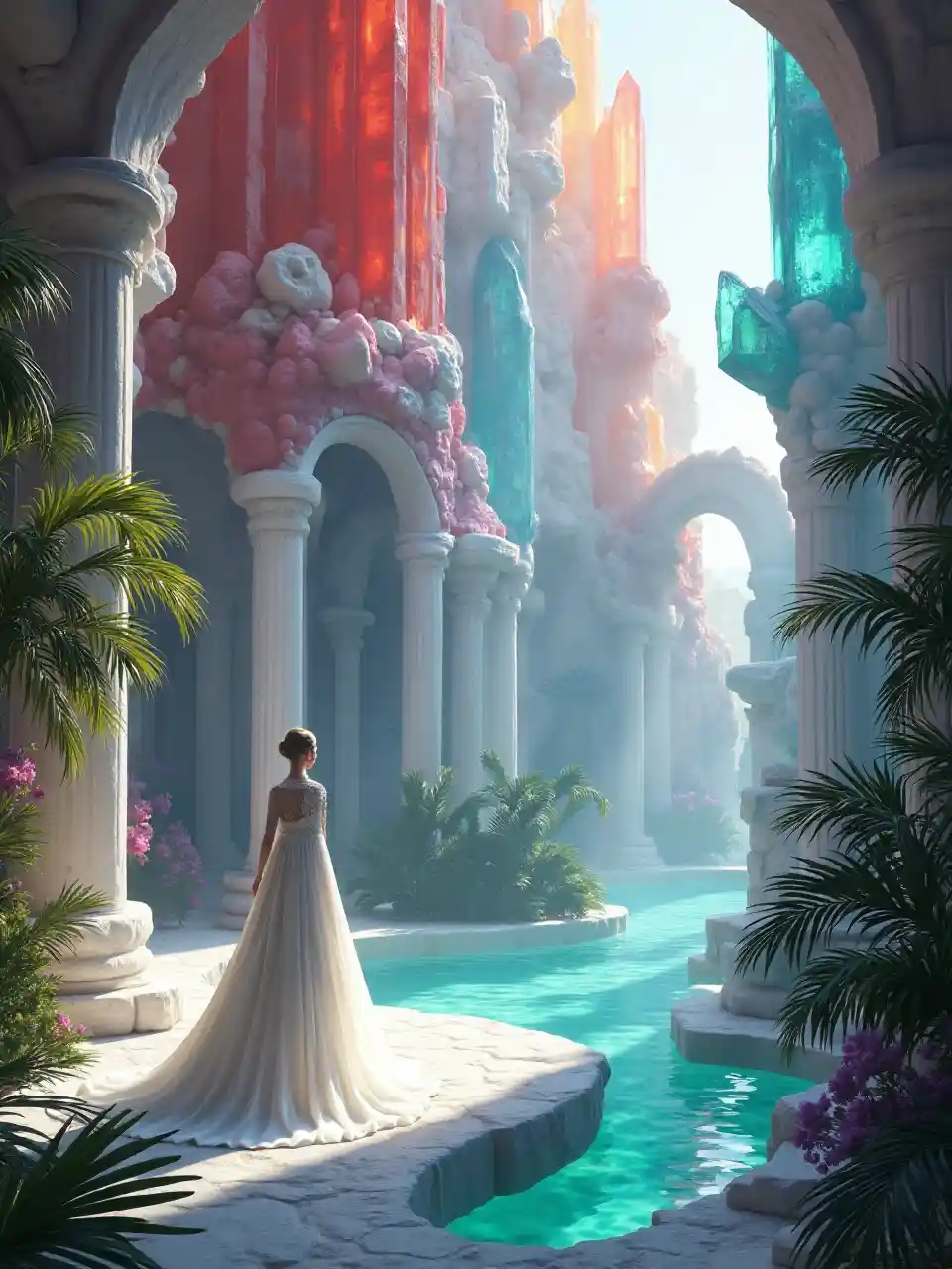 Interior istana yang fantastis sepenuhnya terdiri dari kristal kuarsa besar dalam nuansa merah, biru, oranye, dan ungu tua, serta kristal rubi, safir, amethyst, dan zamrud yang berkilauan. Pilar putih. Kabut. Tanaman tropis yang subur dan pohon palem. Di sebelah kanan berdiri seorang ratu es, mengenakan jubah putih, kereta berkerah tinggi yang mengalir diterangi sinar matahari, memproyeksikan cahaya prismatik melalui dinding kristal yang menembus seluruh adegan. Kolam air hijau. Sihir, suasana halus, detail tingkat tinggi, megah dan surealis.