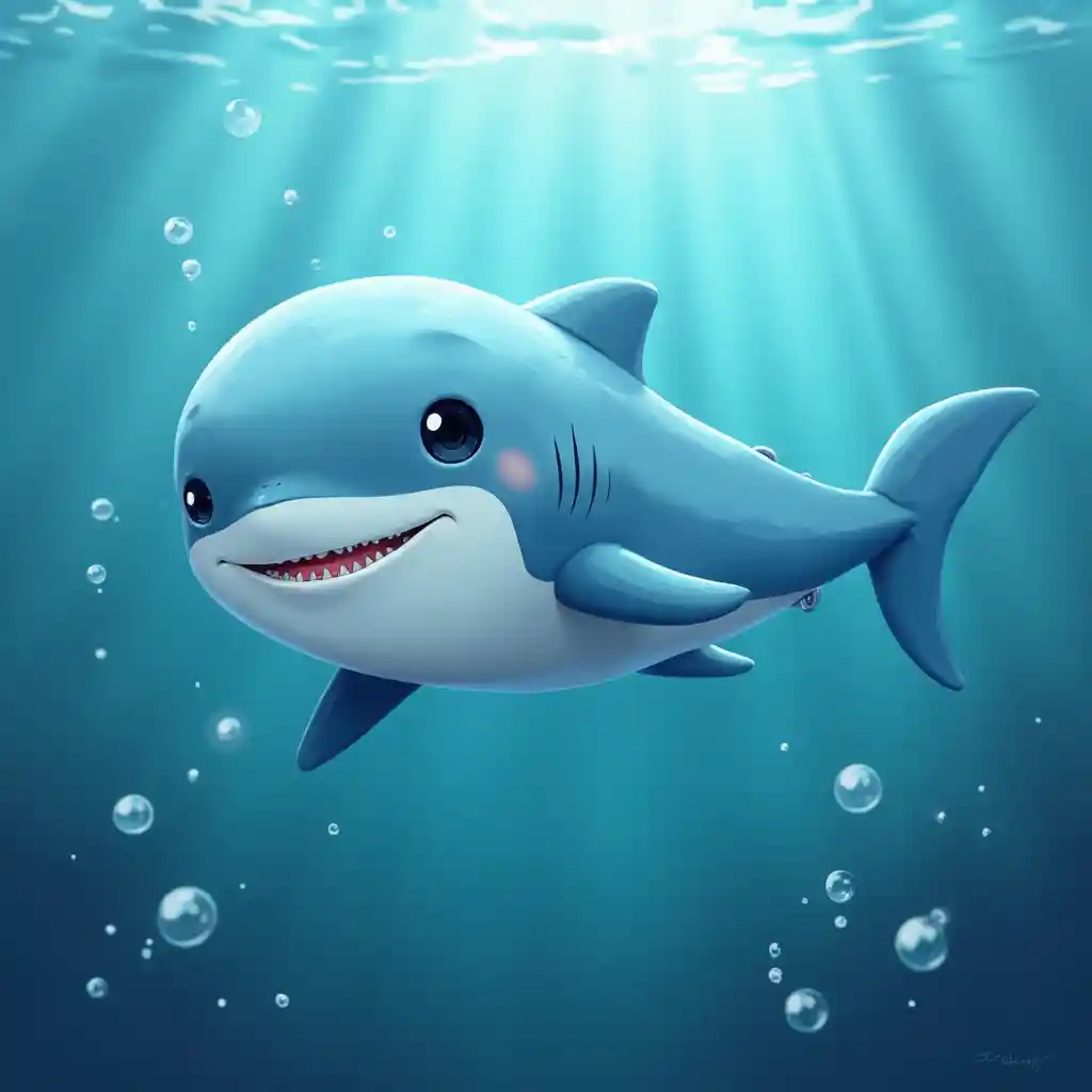 PaisleyBayi megalodon biru dan putih yang lucu dengan aksen perak berenang di bawah air yang dikelilingi oleh gelembung
