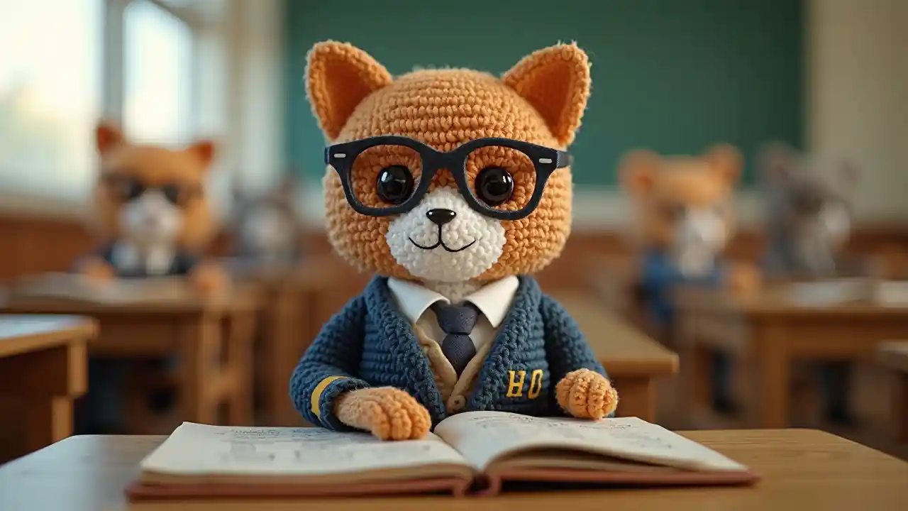 Crochet Cat di Seragam Sekolah Membaca Buku Pelajaran