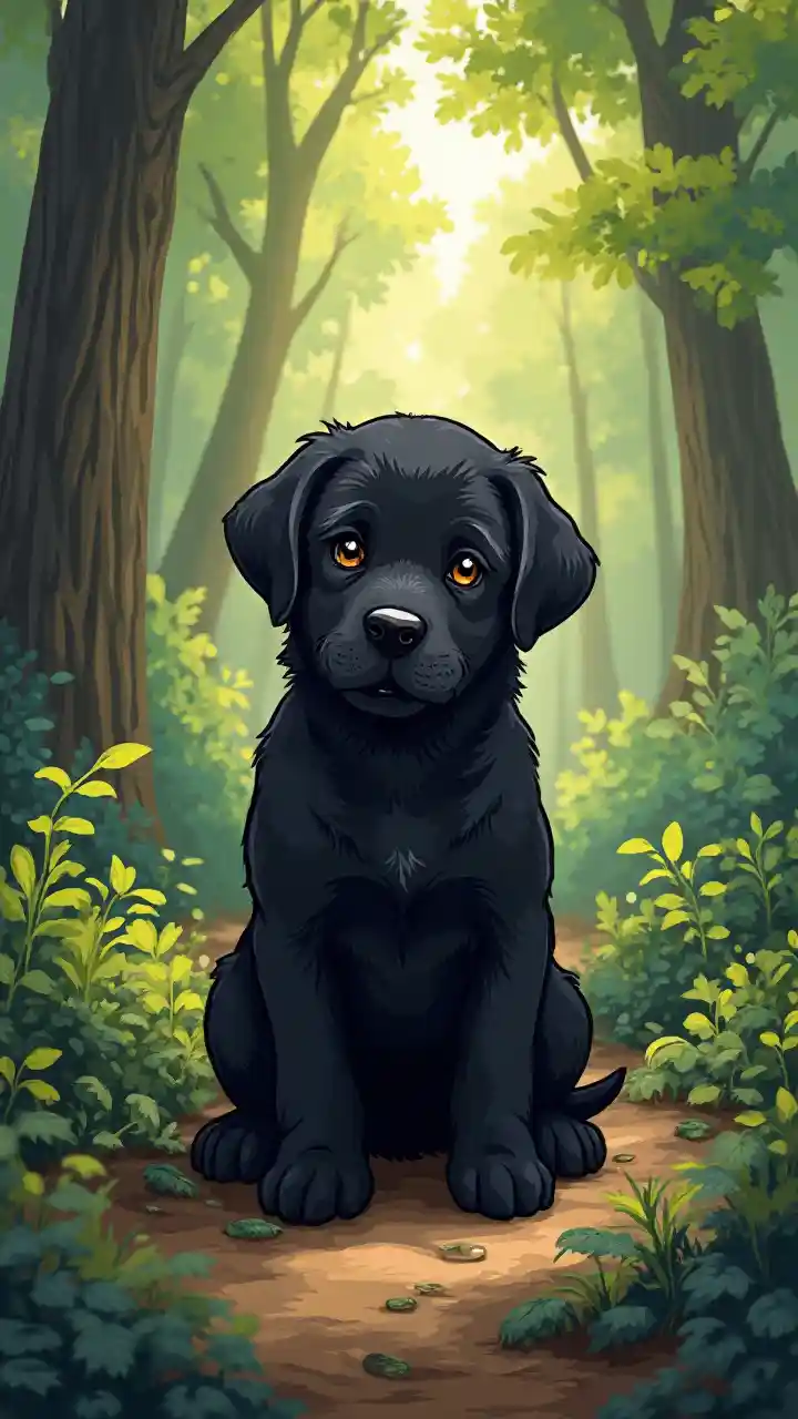 MiaAnime Lucu Hitam Labrador Puppy Di Hutan Dengan Latar Belakang Cat Minyak