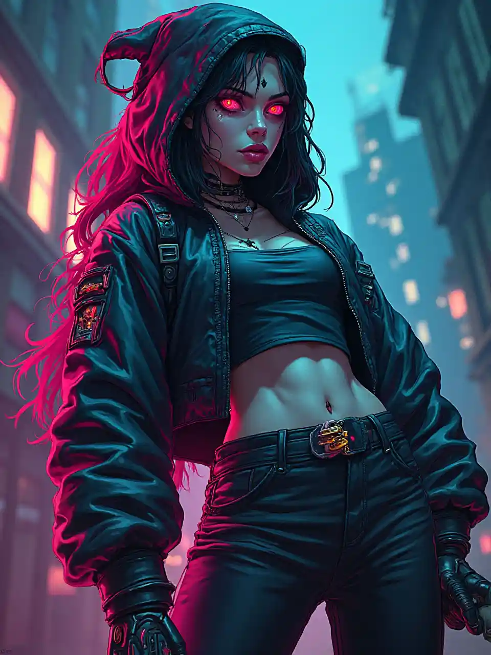 Ilustrasi bergaya avant-garde yang menggabungkan elemen fantasi gelap dan cyberpunk, mengambil inspirasi dari estetika buku komik yang gigih dengan tekstur yang menonjol dan warna dasar yang dinamis. Gambar referensi digunakan sebagai titik awal, dengan garis yang berani, warna yang dinamis, dan menekankan detail pencahayaan neon berteknologi tinggi sambil mempertahankan suasana yang menghantui dan misterius.