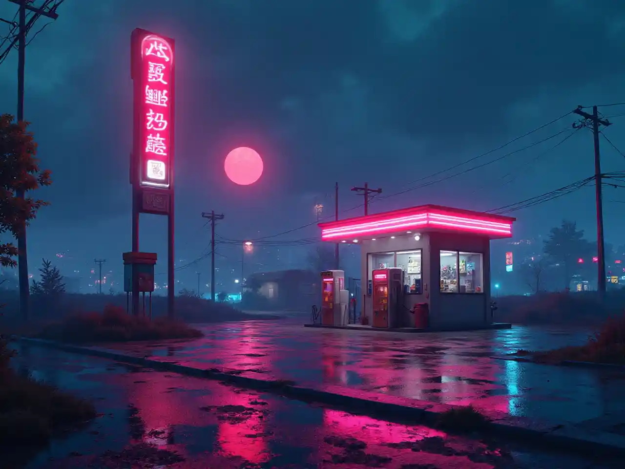 Neon Nocturne Sebopunk Pom Bensin Pemandangan, Seni Digital, Workstation, Detail Tinggi yang Luar Biasa