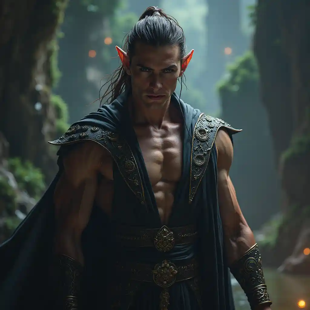 Antagonis elf laki-laki yang mencolok, memancarkan aura misteri dan kekuatan, diatur dalam latar belakang fantasi yang menakjubkan, diterangi oleh cahaya sinematik dramatis yang menyoroti fisiknya yang sempurna dan fitur wajah yang dipahat; matanya yang tajam dan seringai jahatnya menyiratkan pikiran yang licik dan ambisius, dan jubahnya yang elegan dihiasi dengan pola rumit yang menyiratkan pengetahuan kuno yang misterius; Adegan itu memancarkan perpaduan antara bayangan dan cahaya yang menggoda, menciptakan mahakarya visual yang menangkap esensi dari keanggunan gelap dan intrik fantasi.