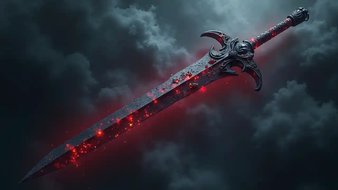 Pedang sihir gelap dengan rune merah gelap bercahaya, pisau obsidian, dikelilingi oleh kabut bayangan, gaya fantasi, detail tinggi, pencahayaan dramatis, mengambang di ruang hampa, resolusi tinggi, aura ajaib, fantasi gelap abad pertengahan 32x32