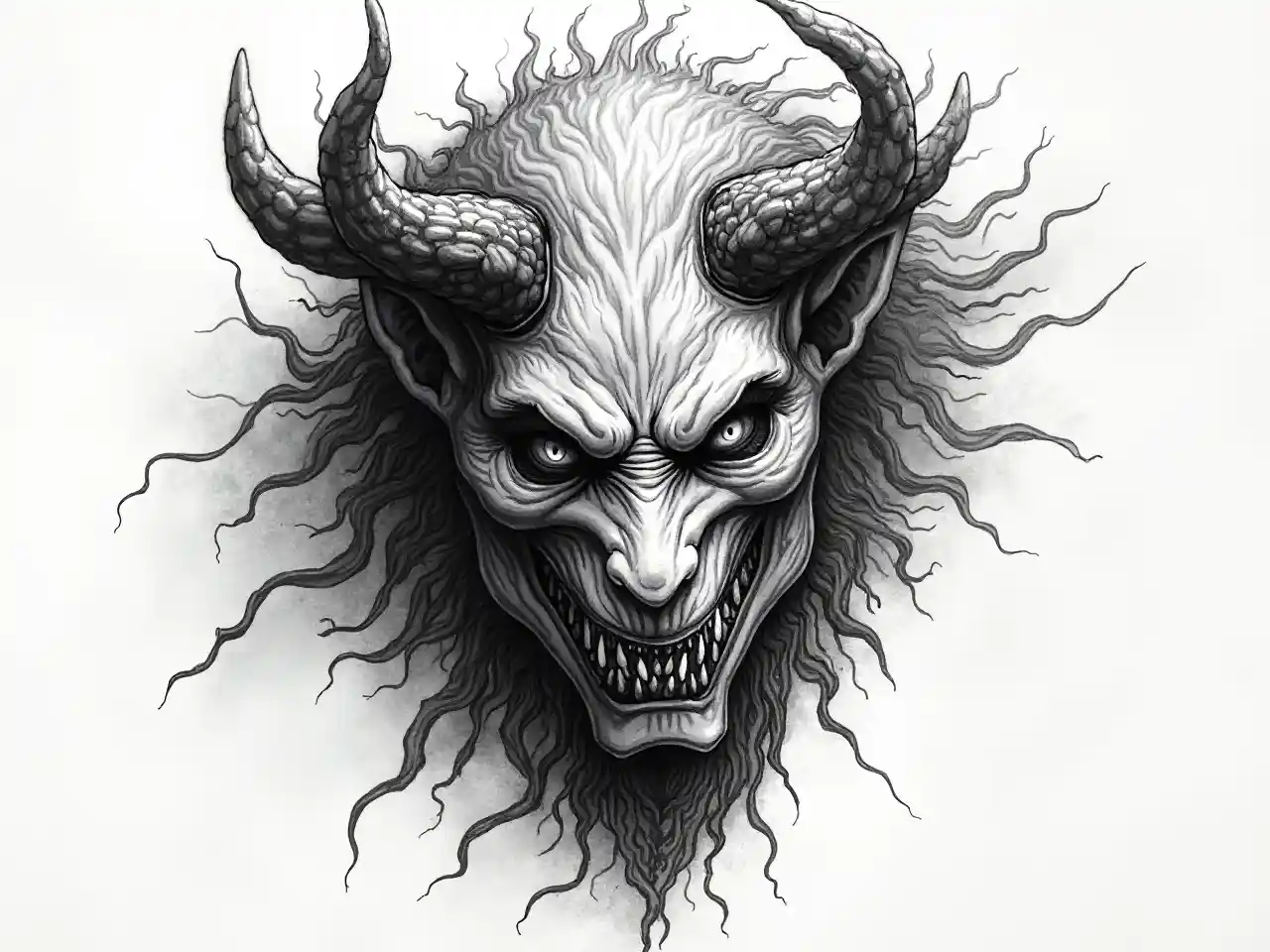 Detail tinggi dibandingkan dengan sketsa tinta wajah iblis. Latar belakangnya putih. Siluet harus memudar menjadi putih dengan elegan