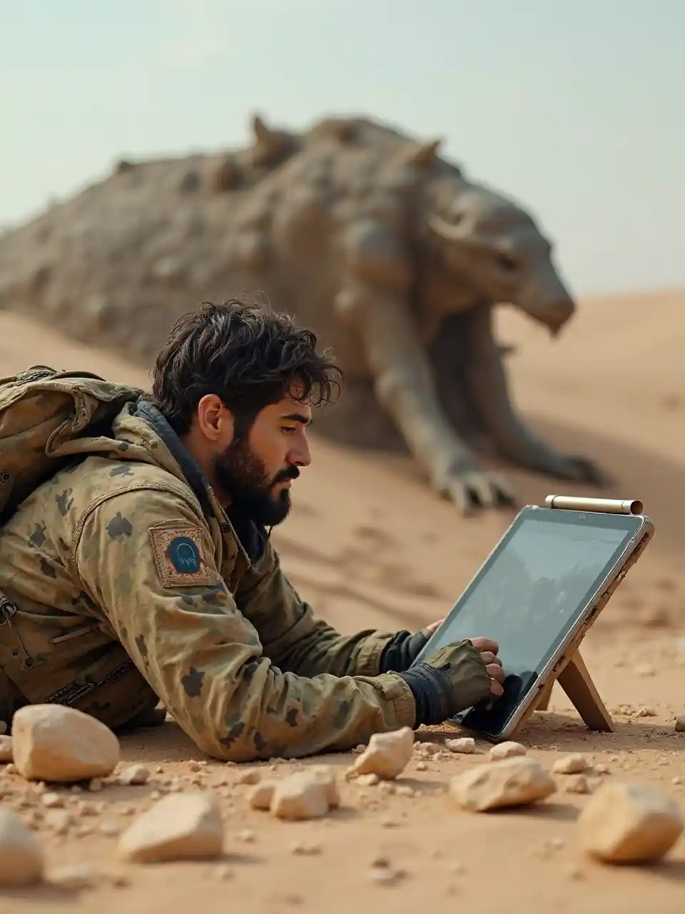 Potret, close-up, melihat ke samping, seorang penembak jitu penyamaran gurun yang kasar tergeletak di tanah, sebagian tersembunyi oleh tumpukan batu yang rusak, dan di sampingnya adalah iPad yang menampilkan video YouTube, iPad yang ditempatkan di tempat iPad kecil. Di luar Sniper, Anda dapat melihat satu (cacing pasir ganas raksasa dalam film Dune) dengan gaya yang kreatif, menawan, dan fantastis.