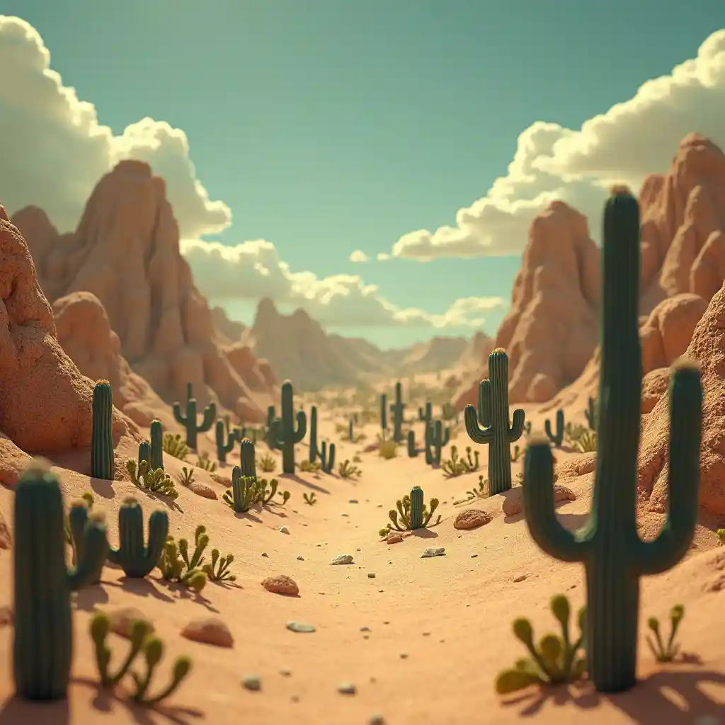 Wallpaper menarik dari gurun dengan pemandangan pasir, gunung, dan kaktus, dibuat sebagai film gaya stop-motion Tim Bolton, tanpa karakter, hanya pemandangan