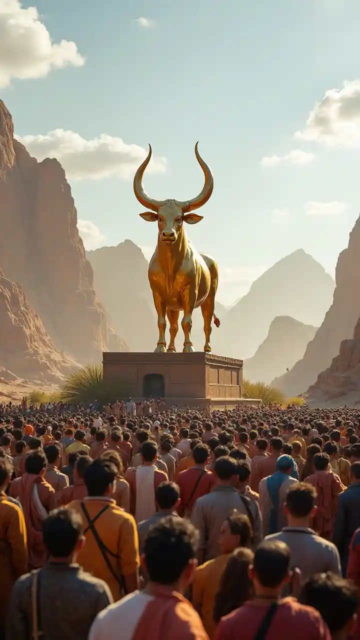 HenrySekelompok besar orang menyembah patung Taurus di salah satu platform di lanskap padang pasir yang luas dengan formasi batu.