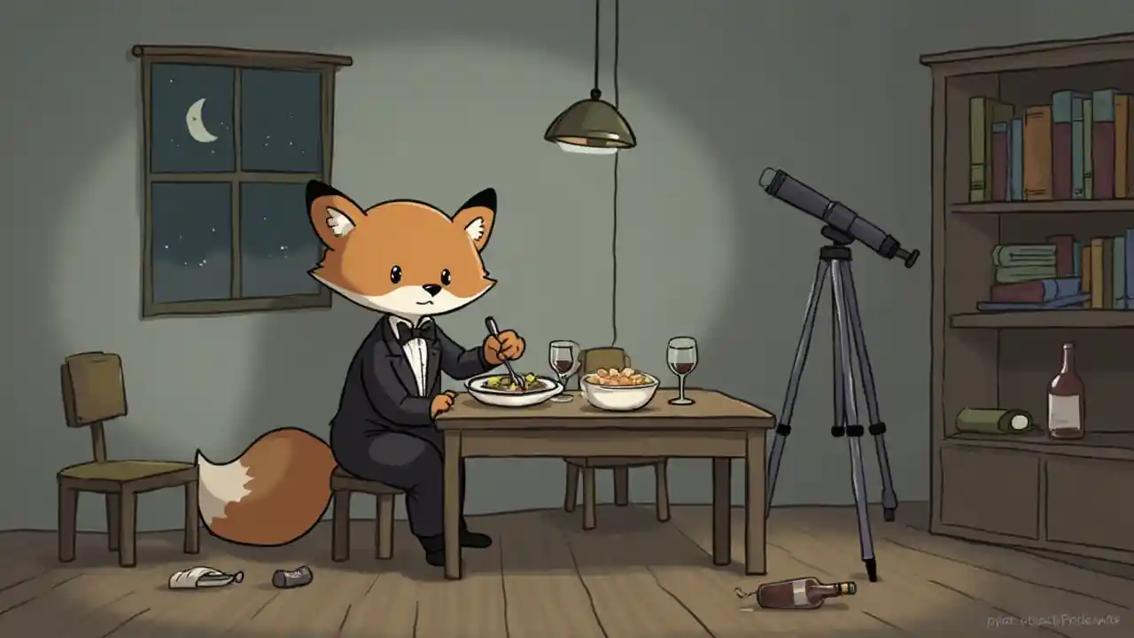 Ini adalah ilustrasi digital yang aneh dan bergaya kartun. Lingkungan adalah ruang makan yang nyaman dan remang-remang dengan lantai kayu dan dinding abu-abu muda. Di latar depan, seekor rubah duduk di meja kayu, mengenakan setelan hitam dengan kemeja putih dan dasi kupu-kupu hitam. Rubah sedang memegang sendok dengan kaki kanannya, bersiap untuk menyendok makanan dari mangkuk di atas meja. Dua mangkuk makanan, dua gelas anggur, sebotol anggur diletakkan di atas meja, menyiratkan bahwa makanan sedang berlangsung. Latar belakang termasuk kursi kayu sederhana di sisi kiri meja, dan rak penuh buku di sisi kanan. Sebuah teleskop kecil ditempatkan di stan dekat jendela untuk melihat bulan sabit dan bintang-bintang di luar. Hanya ada satu lampu gantung di ruangan yang melemparkan cahaya lembut. Di lantai dekat meja, ada botol kecil anggur yang terbuka yang menunjukkan tumpahan atau barang yang terlupakan. Suasana keseluruhan hangat dan menggoda, dengan sedikit imajinasi dan humor. Ilustrasi menggunakan warna pastel, dominan abu-abu dan coklat dengan aksen putih dan hitam.