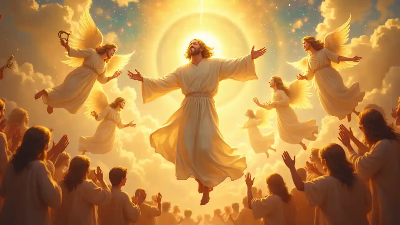 Gambaran yang bercahaya dan penuh sukacita menggambarkan Yesus Kristus menari dengan anggun di surga, dikelilingi oleh malaikat yang bercahaya. Yesus mengenakan jubah putih dan emas yang berkilauan dengan cahaya ilahi, dan Dia merayakannya dengan tangan terbuka. Malaikat-malaikat di sekelilingnya bermacam-macam: ada yang memainkan kecapi emas dan terompet, ada pula yang menari di udara dengan sayap berbulu-bulu berwarna pelangi. Dengan awan emas yang lembut di latar belakang, semburan bintang, dan galaksi halus yang melayang di antara warna safir dan amber. Di bawah mereka, lautan para penyembah tembus pandang, bertepuk tangan dan bernyanyi dengan harmoni. Suasana dipenuhi dengan kehangatan, kedamaian, dan kegembiraan di langit. Gaya: Renaissance - Meet - Seni digital modern, ultra-detail, pencahayaan bercahaya lembut, nada hidup namun sakral. "