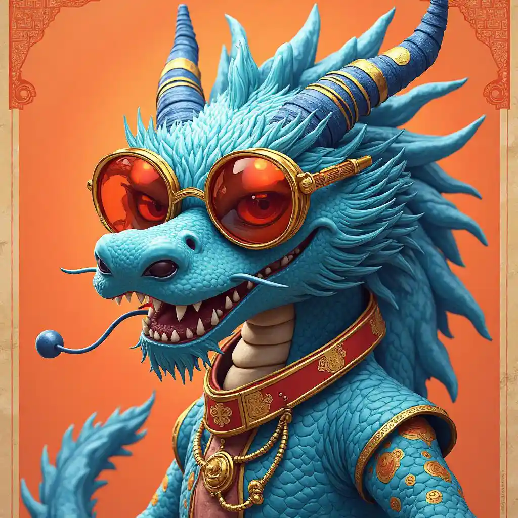 Naga biru dengan poster kacamata hitam, gaya gaya oriental, surealisme pasca-apokaliptik, merah oranye muda, 32k HD, chinapunk, dirancang dengan baik, detail kostum --ar 73:128--stylize750 --v 6