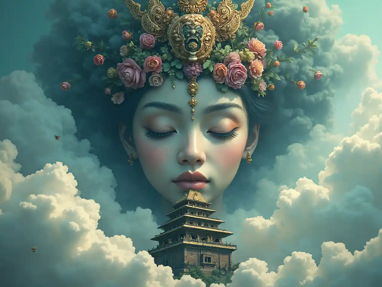 JaceSampul buku dengan wajah wanita, candi Indonesia, awan melamun, gaya surealis
