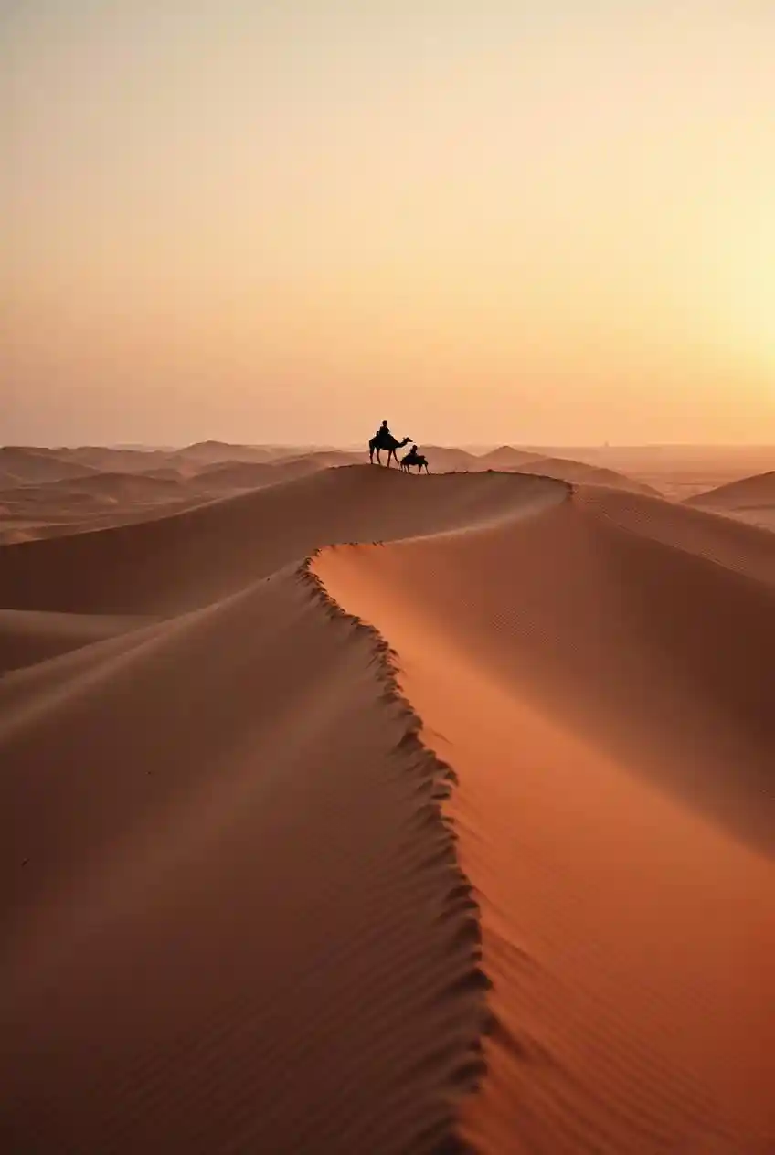 Bukit pasir yang bergulung-gulung dengan sosok kafilah unta yang menyendiri di kala senja.
