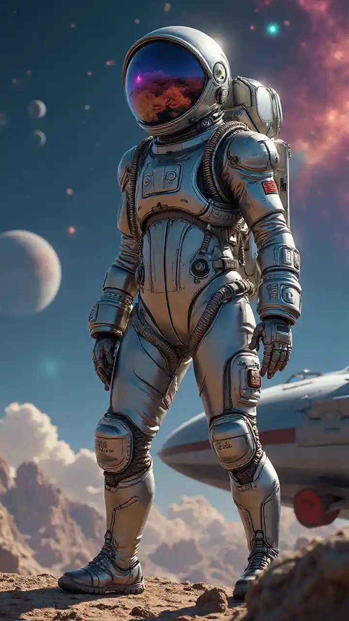 Nenek penjelajah ruang angkasa, mengenakan setelan baja tahan karat berteknologi tinggi, berdiri dengan bangga di bawah langit alien, dengan visor yang memantulkan warna-warna cerah dari planet-planet yang jauh dan nebula yang berputar. Respiratornya, yang dirancang dengan hati-hati, menambahkan sentuhan teknologi canggih. Dari bawah, pemandangan ini menekankan kehadirannya yang megah saat dia berdiri di samping pesawat ruang angkasa yang mulus. Inti dari gaya cover art Eddie Jones ditangkap dalam detail yang sangat halus, memancarkan semangat petualangan yang mengingatkan pada dunia yang diciptakan oleh Harry Harrison.