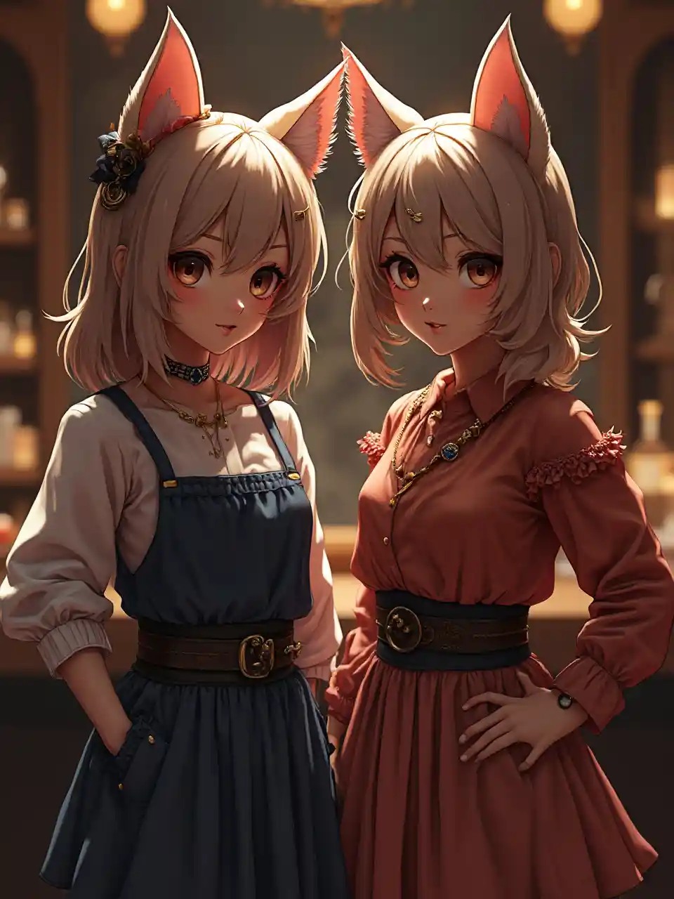 Dua gadis neko remaja yang tidak konvensional memecahkan bar cokelat Dubai yang mewah dengan mode avant-garde, pencahayaan dramatis, detail tinggi