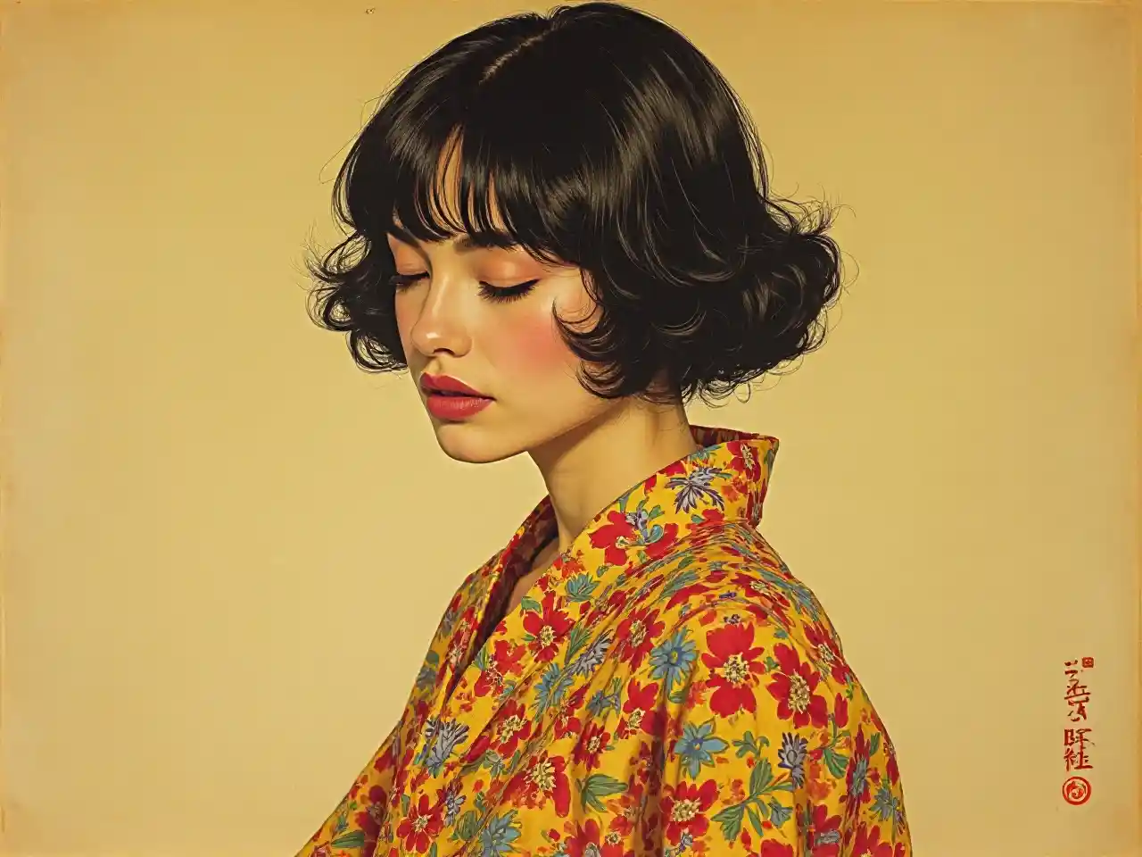 Chloeeiza gonzález portrait by ikenaga yasunari and ayana otake and ko rakusui, 6 0 s poster, drawing, realistic, sharp focus, japanese, dreamy, nostalgia, faded, golden hues, clothes with floral pattern