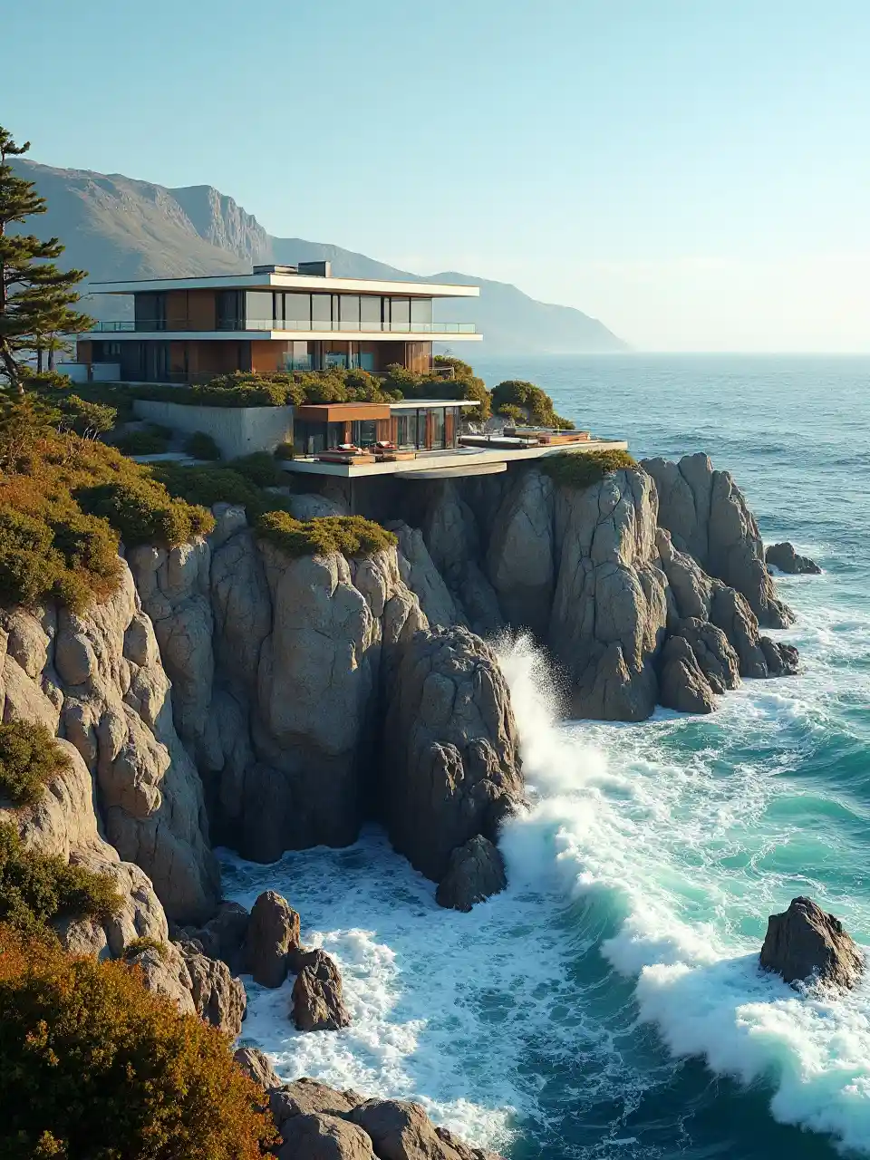 Rumah ultra-modern modern modern abad pertengahan, bertengger megah di tebing, menghadap garis pantai berbatu dramatis, ombak besar menghantam batu-batu kasar, arsitektur yang indah bersinar dengan pemandangan yang elegan, penuh warna dan dinamis, suasana sinar matahari yang cerah, resolusi 8K, ultra-detail, fotografi profesional berkualitas tinggi, latar belakang lanskap pantai yang semarak, kedalaman dan kehangatan yang mendalam.