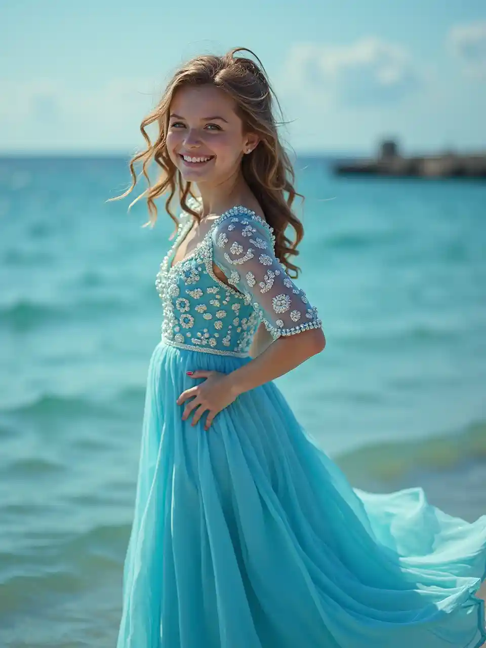AuroraGaun gaun, Gaun fashion blockbuster, Mutiara jahit lengan, Bordir benang perak, Gaun ekor ikan, Gaun mengalir, Air biru dan jernih, Kembali tersenyum, Playful, Tekstur poster