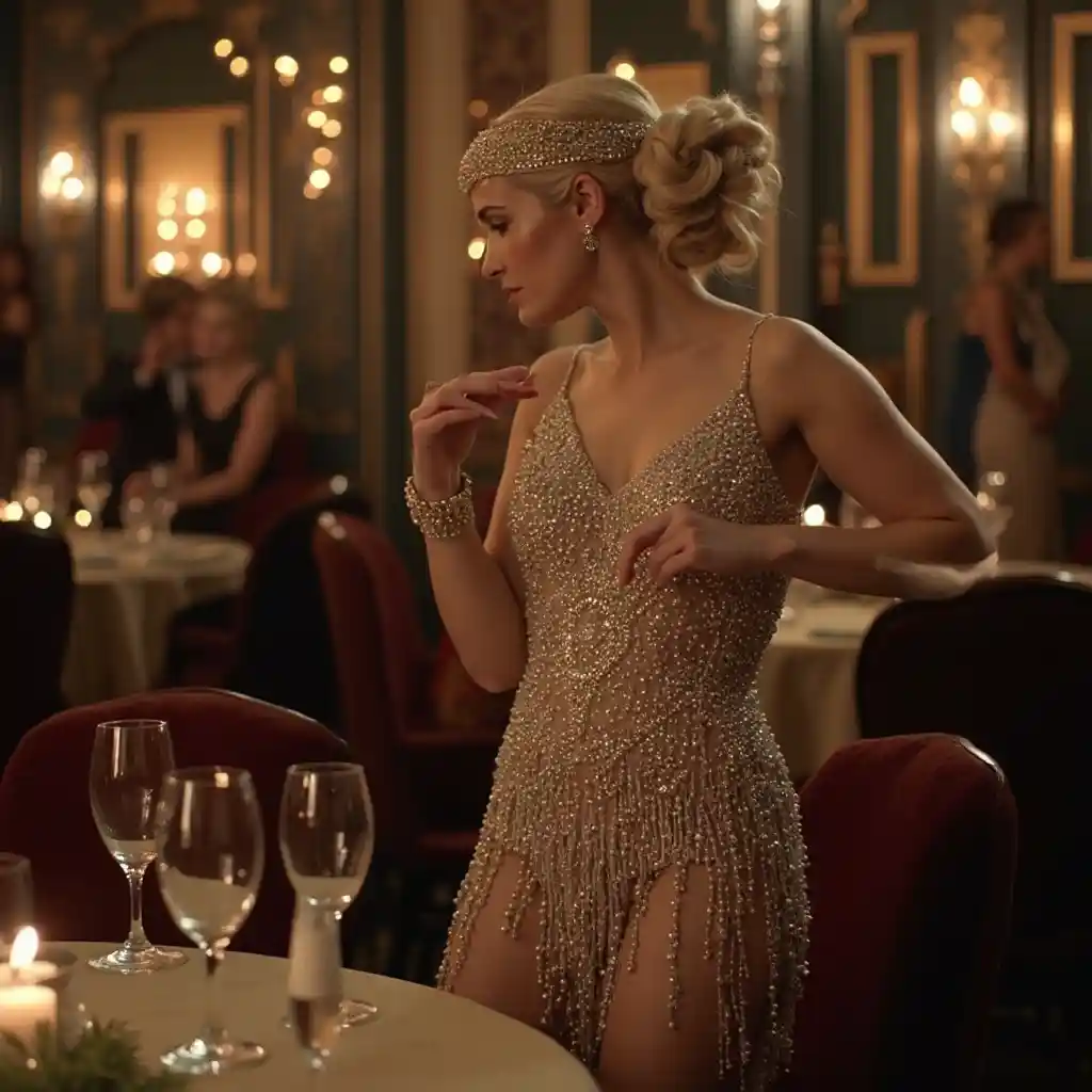 Pada pesta bertema Gatsby, seorang wanita kulit putih berusia 40-an bersinar dengan gaun selotip manik-manik. Seruling berwarna sampanye dan dekorasi Art Deco membingkainya, dan gerakannya yang elegan memancarkan godaan abadi.