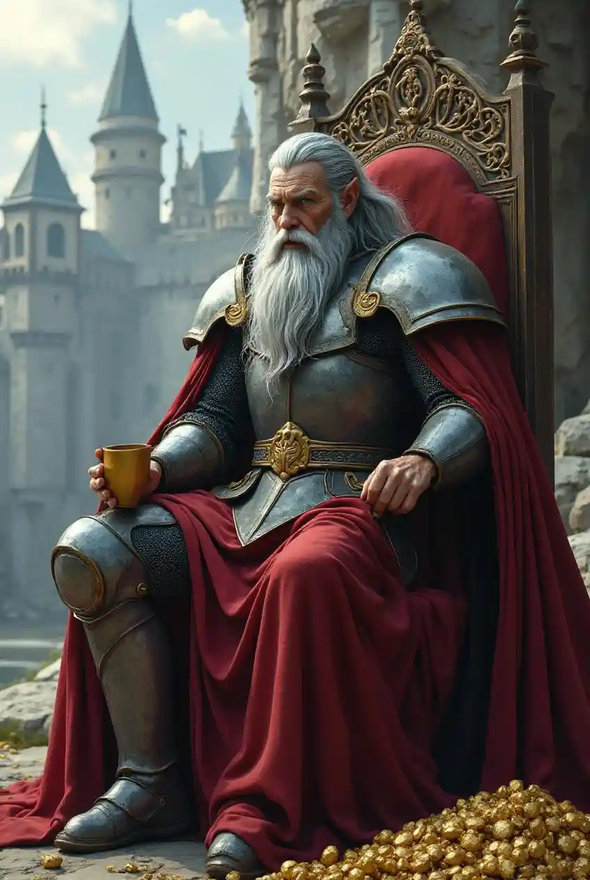 Elf berusia 50-an. Dia memiliki rambut abu-abu panjang dan kumis abu-abu. Dia kencang dan jantan. Dia duduk di sebuah takhta besar dengan sebuah kastil di kejauhan dengan pedang kembung bersandar di atas takhta. Dia melihat ke depannya. Dagunya terangkat dan matanya tampak marah. Dia mengenakan armor perak dan mengenakan jubah merah panjang. Dia memegang piala emas. Ada pelayan di sekitar mereka, emas bertumpuk