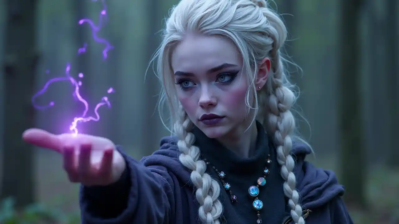 Wanita elf cantik dengan kulit berwarna abu-abu dan lembayung melakukan sihir, rambut putih panjang diikat setengah sanggul, mata putih bersih tanpa warna, eyeliner blur hitam, memakai kalung rosario yang terbuat dari manik-manik pelangi, memakai jubah berkerudung, detail memukau, warna gothic