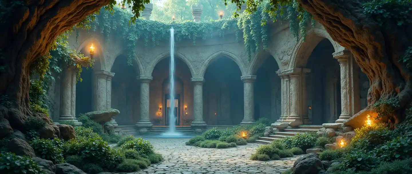 Ruang ceruk istana kerajaan sihir pusat; hijau dengan lumut yang mengembun; kerikil aneh; obor romantis menerangi ElvenLabyrinth; patung fantastis Hyper deret Fibonacci bercabang rumit; microleaves; rumput berkilau; cahaya pelangi di sungai di air terjun yang jauh; rincian kecil dari kilau elektronik; kerajaan kota peri yang realistis; debu peri yang berkilauan; Dinding istana berlapis emas renda sutra perak melilit neon beludru gairah rumit dicat baki foto realthe expansive vistas alto cum bec; minyak impasto; akrilik mengkilap rumit detail halus palet kaya mengambang elf bola lampu e merah muda dan biru