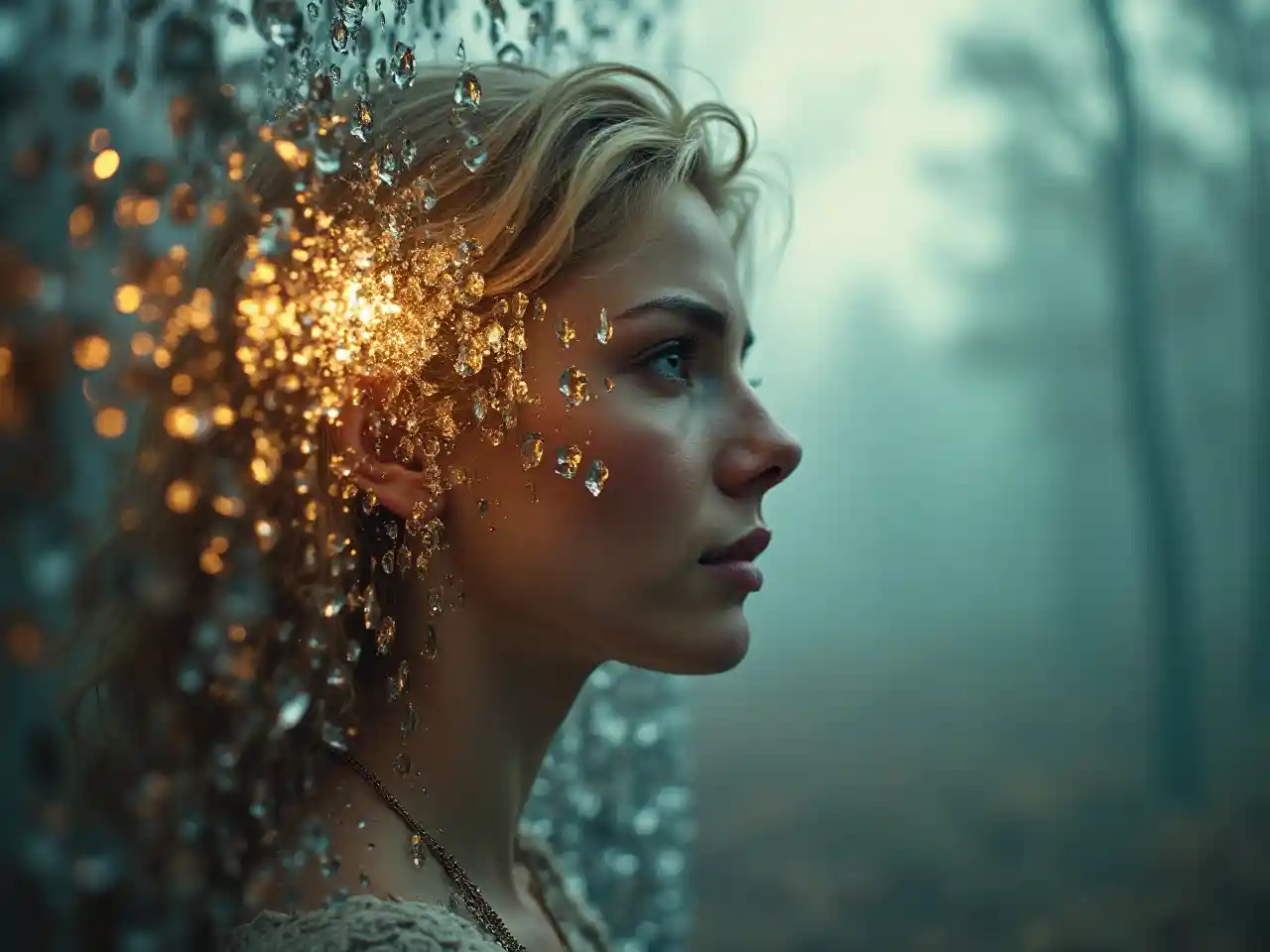 Sebuah gambar emocionql menakjubkan dari seorang wanita berambut pirang V menjadi lumpuh, antara masa lalunya - dia di sebelah kiri dan masa depannya - dia di sebelah kanan. Masa lalunya bercampur dengan penaklukan dan kehilangan, seperti cermin fragmen kekacauan yang terfragmentasi, mencerminkan saat-saat yang berbeda dalam hidupnya dengan suaminya, putra dan putrinya, anjingnya, rumahnya, kantornya, kliniknya, popularitasnya hampir tidak dapat ditaklukkan. Ada juga perceraiannya, kejenuhannya, saat-saat menyakitkan yang tidak dapat dibedakannya dari putrinya, psikosis, dan bunuh dirinya. Tepat di sebelah kanan masa depannya., Kabut kehampaan, rasa sakit yang tak terbatas, dan keraguan, setelah mengalami episode twist, bertemu dengan pria lain dengan sentuhannya, nd untuk tinggal di rumah pedesaan yang indah, dan setiap kali dia bertanya pada dirinya sendiri apakah itu surga atau penjara ….