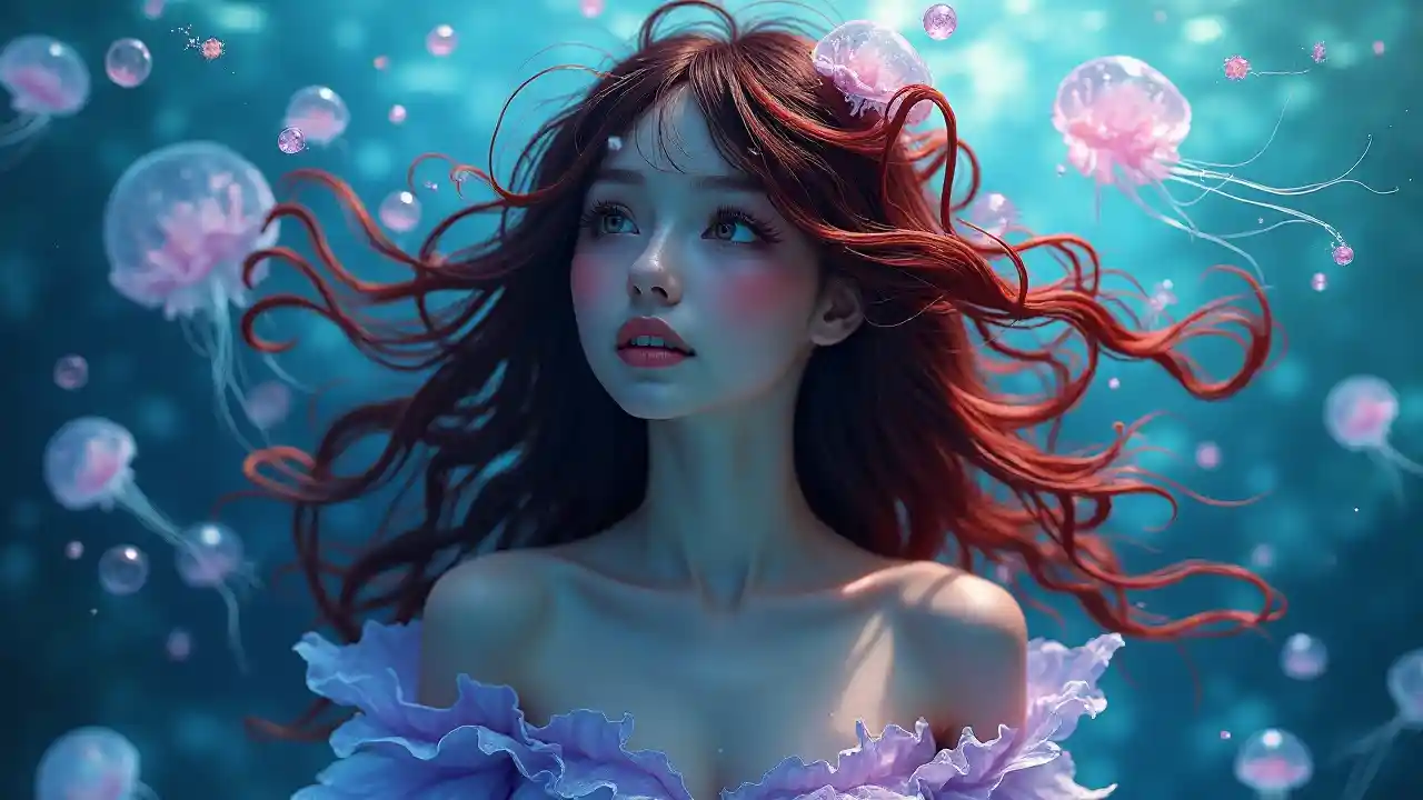 Yang satu (((Peri kecantikan halus surealis)) dipasangkan dengan yang mengalir, (((panjang, mengkilap, rambut hitam merah tua)), berpakaian ((tembus, pakaian peri berwarna pelangi, sempurna cocok dengan fitur halus nya))), menyatu mulus dengan palet warna hidup ultra-realistis, air berkilauan memantulkan cahaya halus. Adegan lebih lanjut disorot oleh ((gelembung halus dan ubur-ubur) warna ungu tua dan biru muda) menari lembut di sekelilingnya, meningkatkan suasana fantasi bawah air yang aneh. Mata para peri bersinar dengan misteri dan keajaiban, mencerminkan keajaiban dan keanggunan dunia bawah laut.