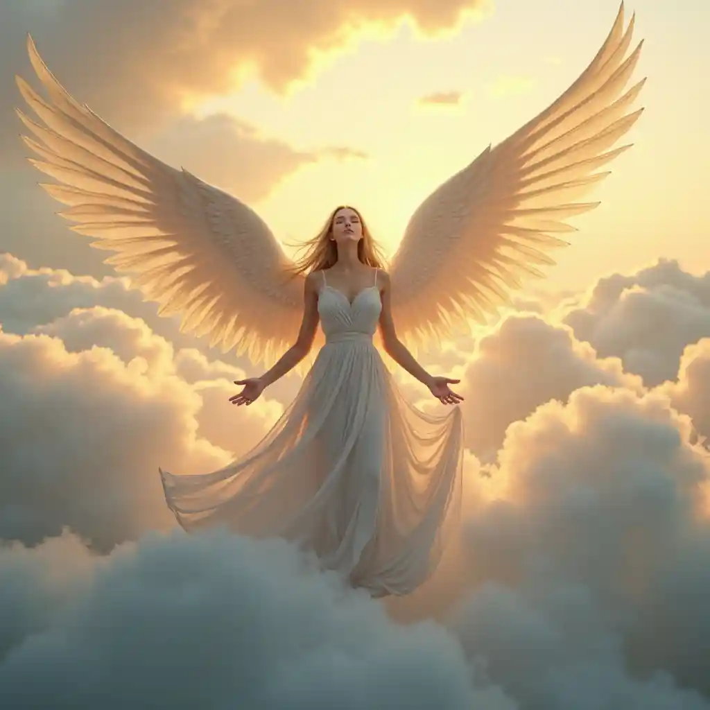 Kokoh ((Bidadari Wanita Cantik)), dengan sayap besar yang terentang ke luar, menyanyikan lagu-lagu menenangkan di atas ((awan matahari terbit yang indah), sambil mengapung anggun di atas (ombak yang bergulir lembut), menyatu mulus dengan kabut pagi halus yang menyapu tubuh, memancarkan aura damai dan elegan