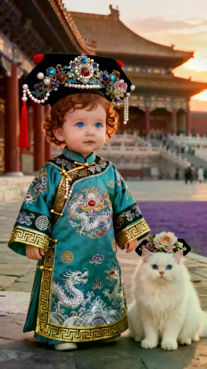 Bayi Eropa yang lucu, 1 tahun, dengan kulit putih seperti porselen, rambut ikal coklat lembut, dan mata biru besar yang berkilau. Dia mengenakan pakaian wanita khas istana Dinasti Qing, yang menunjukkan keluhuran, keanggunan, kehormatan klasik, dan detail yang indah: Dia mengenakan jubah imitasi "Selir Kerajaan" Zhen Huan yang halus dan pas. Jubah itu berwarna biru batu, dihiasi dengan hiasan pola delapan harta karun dan pola naga air, disulam dengan benang emas dan perak. Dia mengenakan mahkota beludru hitam mewah, lengkap dengan jumbai merah dan aksesori mutiara. Detail Aksesori: Kepalanya dihiasi dengan perhiasan dan hiasan kepala yang rumit, diselingi dengan berbagai permata, mutiara, bunga sutra, menunjukkan keahlian yang luar biasa; tepi pakaiannya dan simpul memiliki pola emas yang rumit yang menggemakan warna keseluruhan dan menonjolkan kemewahan dalam detailnya. Dia berdiri dengan khidmat di depan Hall of Supreme Harmony, di bawah atap yang megah, di samping seekor kucing Persia putih bersih yang duduk di ketinggian yang sama dengan gadis kecil itu, yang juga mengenakan bunga sutra di kepalanya. Alun-alun luas Kota Terlarang terlihat samar-samar di latar belakang. Pencahayaan matahari terbenam yang dramatis, nuansa sinematik, super detail, foto realistis, resolusi 8K, mahakarya, kualitas terbaik. Bayi berdiri di ketinggian yang sama dengan kucing Persia duduk, menjaga konsistensi visual.
