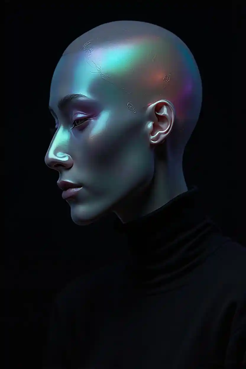 MackenzieClose up pelangi siluet tanpa wajah, fantasi aneh surealis, model modis dengan turtleneck hitam, latar belakang hitam
