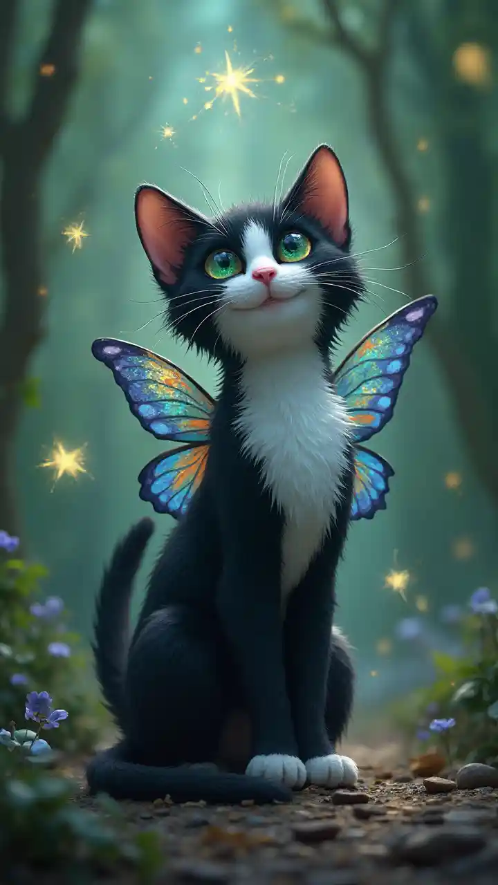 Aku melihat roh peri. Meow. Dia adalah kucing yang berjalan di antara Bumi dan Wonderland. Dia memiliki kekuatan yang tidak dimiliki kucing lain: dia bisa menyemburkan percikan api untuk melindungi dirinya sendiri ketika menghadapi bahaya. Mata kecilnya bersinar seperti senter dalam gelap. Dia bisa berteleportasi dari satu tempat ke tempat lain dalam satu kilatan cahaya. Dia punya telepati dan telepati. Dan yang paling penting.... Dia melihat roh abadi. Dia bermain dengan elf dan peri di ngarai dan hutan yang bermandikan sinar matahari. Para elf bersinar seperti bintang kecil, dan para elf meninggalkan jejak yang berkilauan. Mereka senang bermain dengan satu sama lain, kucing dan teman-temannya. Dia adalah kucing hitam berambut pendek dengan wajah putih dan ekor putih. Mata vinca yang cerah dan bahagia, hidung merah muda berbentuk hati. Ketika tidak ada yang melihat, kucing kadang-kadang mengembangkan sepasang sayap kupu-kupu pelangi yang bersinar dan terbang bersama teman-teman peri. Asana seluruh tubuh, tersenyum dan main-main.