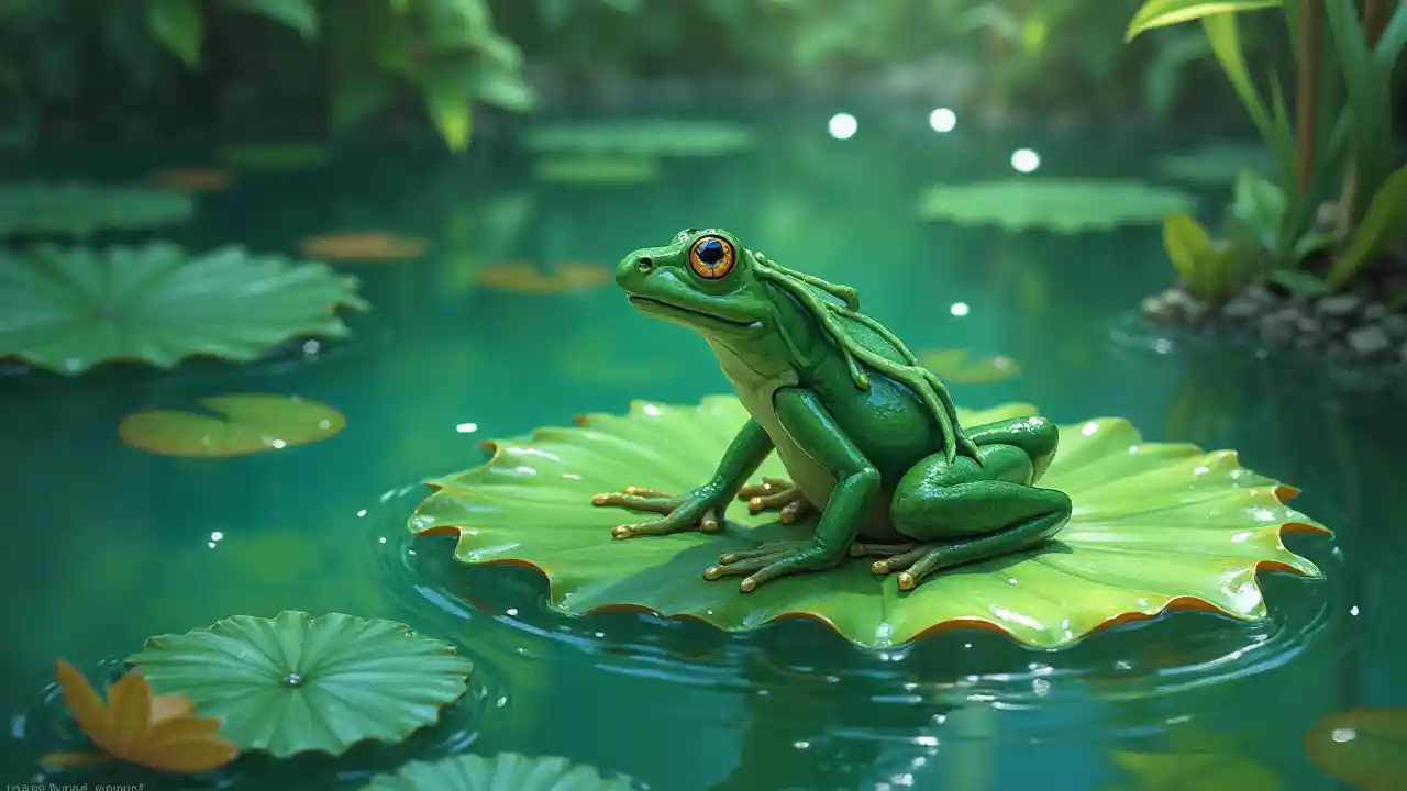 Buat gambar, katak hijau zamrud yang hidup bertengger di atas tikar bunga lili tidur besar di tengah kolam yang berkilauan dan ajaib. Gaya harus fantastis, dan lukisan cat minyak mirip dengan karya seni yang ditemukan dalam trik sulap: permainan kartu berkumpul. Jangan menyertakan tanda tangan artis atau teks apa pun dalam gambar.