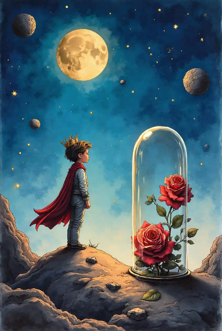 Adegan Fantasi Seorang pangeran muda dengan mahkota kecil berdiri di asteroid di ruang angkasa, melihat mawar di tanah yang ditutupi dengan tabung kaca, garis hitam untuk menggambar siluet, lukisan halus, cat air berat. Warna yang kaya, hidup, dan detail yang kaya. Starry Night
