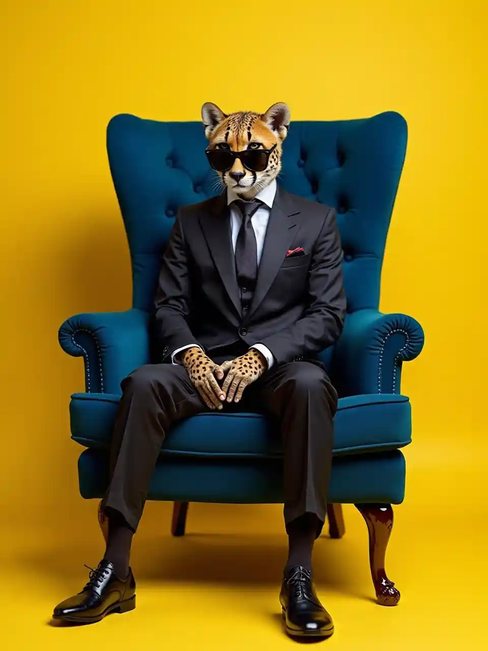 Cheetah yang tampak apik, duduk di kursi beludru biru berumbai, latar belakang kuning cerah, mengenakan setelan mahal, dilengkapi dengan kacamata hitam yang sangat besar, tangan di pangkuan, seluruh tubuh dilengkapi dengan sepatu hitam mengkilap, sarung tangan kulit hitam, sepatu kulit hitam, menghadap ke depan, super menyegarkan, fotografi canon 80d, siang hari, berani, dreamy