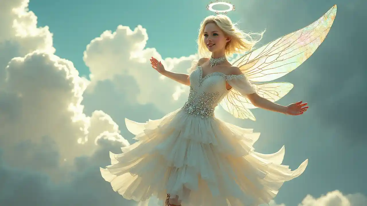 Wanita wanita. Peri Ratu dengan kekuatan Archangel. Sylph, peri. Kaya, royal, elegan. Alam semesta, alam semesta. Wajah cantik awet muda dengan mata hijau kekuningan dengan bulu mata panjang berwarna keemasan. Rambut pendek platinum, sapu samping dan sapu kepala kunci yang jatuh ke samping. Di atas kepalanya ada lingkaran cahaya yang terbuat dari bintang-bintang, dan bintang-bintang di tengah adalah yang paling terang. Telinga elf. Wajah model yang halus dengan bibir merah muda yang mengkilap, tersenyum penuh dengan kegembiraan universal. Kerah berenda putih dengan berlian di tengah leher. Dia mengenakan gaun berlapis lengan panjang keluarga kerajaan putih, bertatahkan kristal, dan ikat pinggang perak bertatahkan berlian di pinggangnya. Bagian bawah gaunnya yang berlapis lebih pendek di kedua sisi, mengungkapkan kaki panjangnya yang indah. Di punggungnya adalah sepasang sayap capung besar, besar, tembus pandang dan berwarna seperti pelangi. Dia mengenakan sepasang sepatu hak tinggi perak dengan tali gladiator perak. Di mana pun dia terbang, dia akan meninggalkan kilatan cahaya, terus-menerus dikelilingi oleh elf dari kedua jenis kelamin. Dia bersinar dengan perak/halo, dan bunga cenderung tumbuh di depannya. Seluruh tubuh berpose, terbang di atas awan.