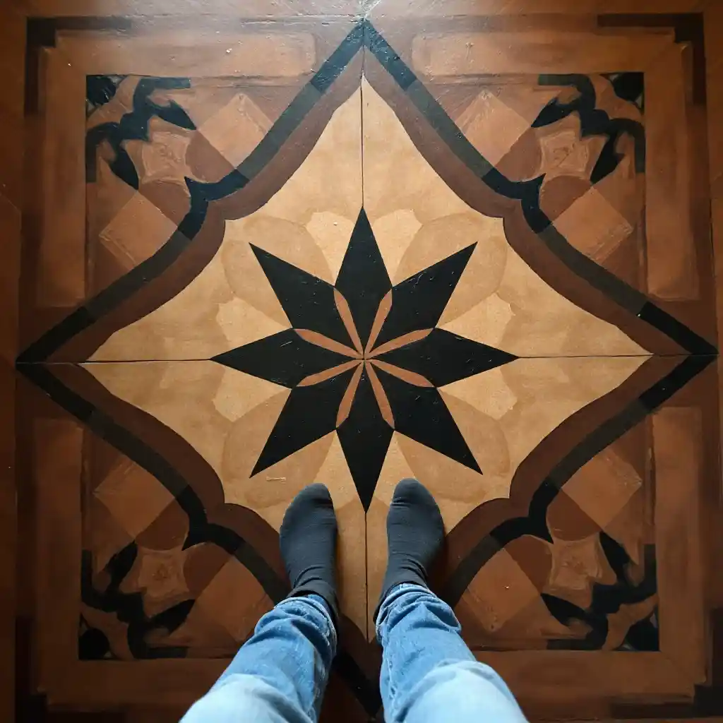 Pola geometris yang menarik tersebar di seluruh lantai, menampilkan warna coklat yang kaya dan warna hitam dan putih yang mencolok, menciptakan desain bintang dan berlian yang rumit. Sudut pandang dari atas, berfokus pada dua kaki - satu kaki mengenakan kaus kaki gelap dan kaki celana biru muda di kaki lainnya, menyiratkan lingkungan yang santai atau santai. Lantai memantulkan kilau mengkilap yang mungkin menandakan ruang yang terpelihara dengan baik dengan cahaya yang menyiratkan suasana yang hangat dan intim. Sudut pandang dekat ini, sambil menyampaikan rasa ruang pribadi, mengundang pemirsa untuk menghargai seni dan pengerjaan lantai.