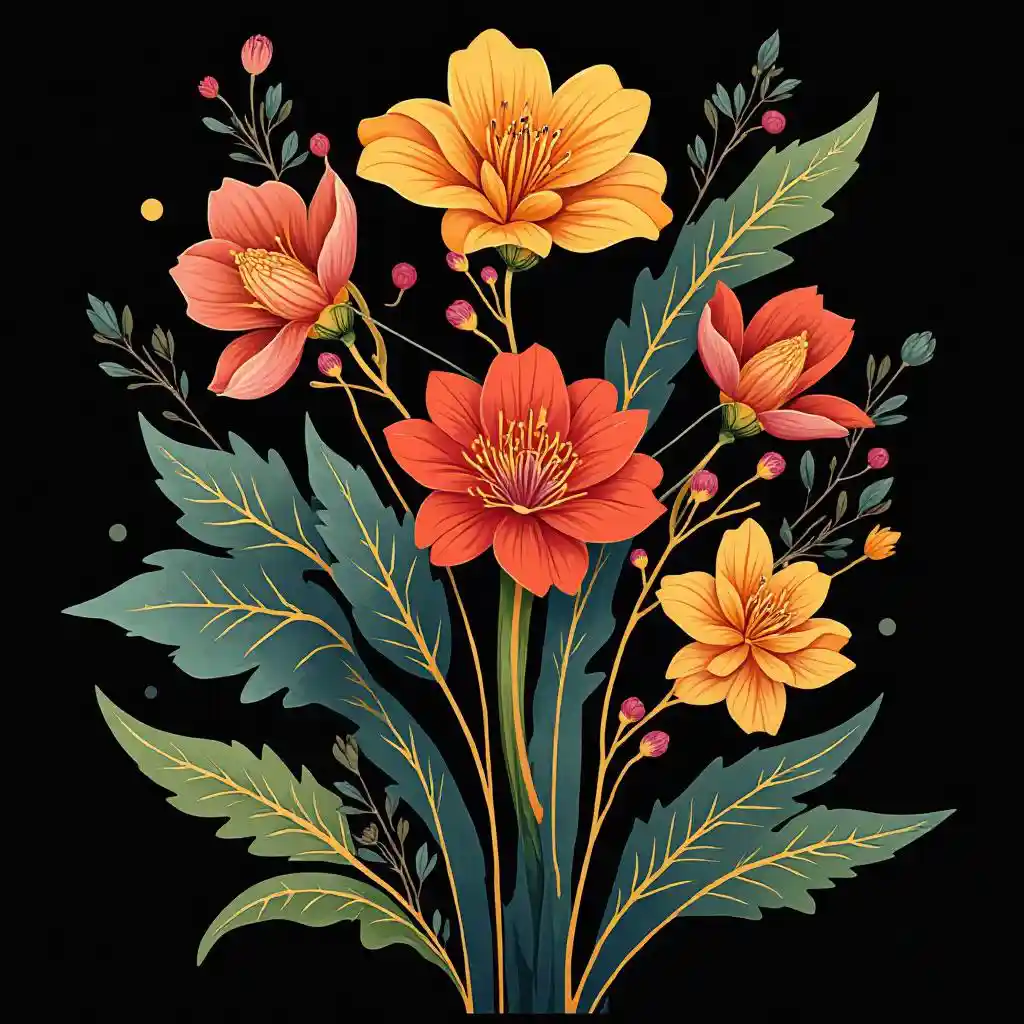Disegnate un vivace motivo floreale geometric astratto in una fusione di stili Art Deco e Pop Art,con linee decise,colori vivaci e forme dinamiche,su un elegante sfondo nero che aumenta l'impatto visivo del disegno。