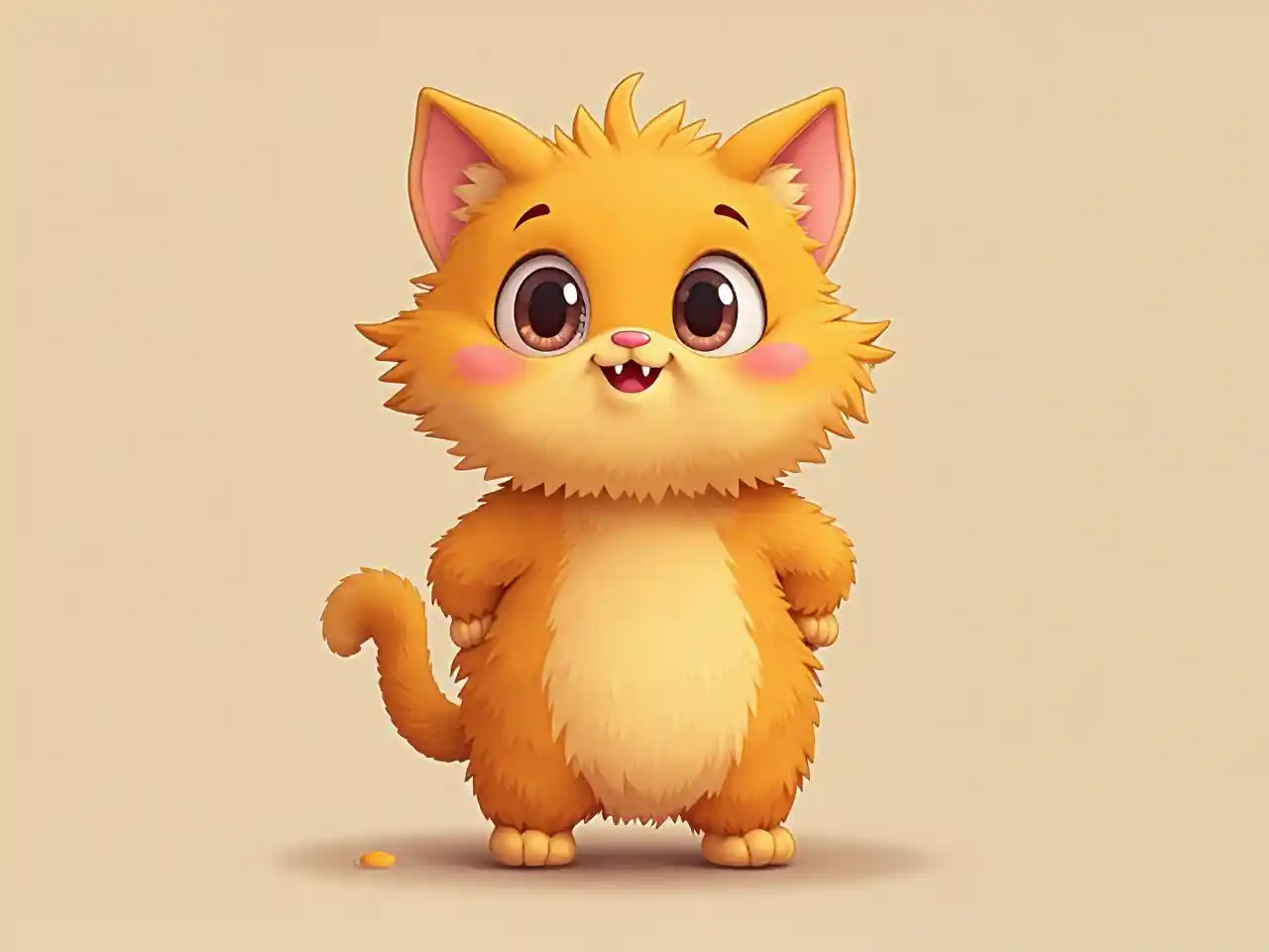 MackenzieSeekor kucing kartun oranye berbulu dengan mata besar berdiri dan tertawa.