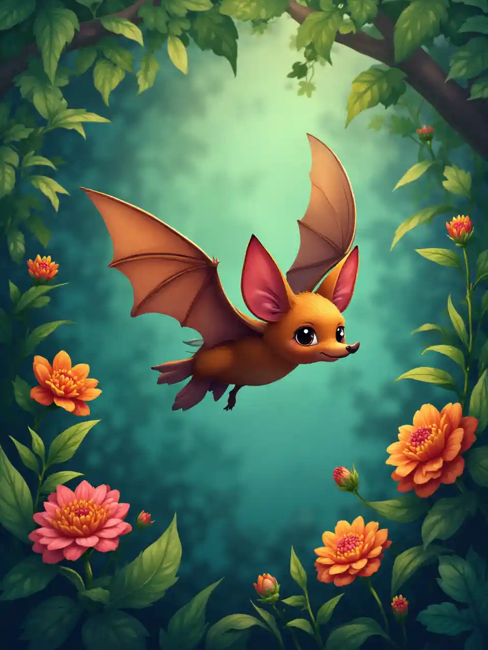 AubreyKelelawar flying fox meluncur di atas pemandangan hutan hijau yang subur dengan bunga-bunga berwarna-warni seperti yang ditunjukkan pada gambar.