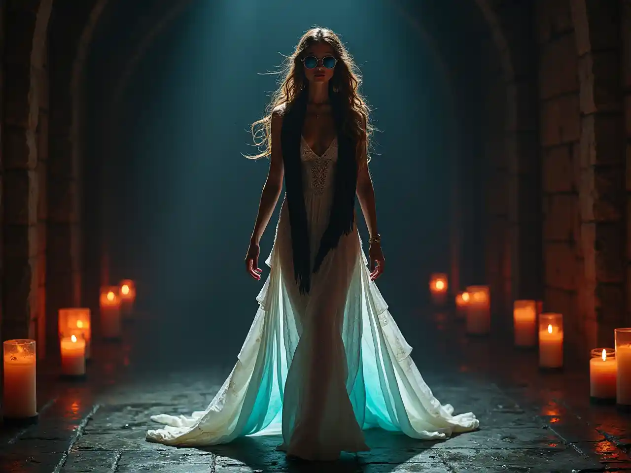 Super Realistic Full Body Photography Model papan atas yang cantik, berjalan di tempat kejadian, beraksi, berambut panjang, cantik bak malaikat yang menawan, mengenakan gaun panjang berbentuk spektrum jamur putih, mengenakan kacamata hitam futuristik, lampu seperti jamur, dihiasi dengan tulisan oriental berwarna merah dan biru dari Arabi thallart kuno, syal kulit rubah hitam, pemotretan studio, latar belakang hitam, dinding hitam batu Basel, lampu remang-remang karena cahaya lilin, magis, udara dipenuhi asap tebal, suasana dramatis, Fotografi warna, oleh Alberto Biasi, sinema 4d rendering, pencahayaan film, pencahayaan dramatis, pemandangan seluruh tubuh, foto diambil dengan Canon, Aperture besar, Pencahayaan sempurna menekankan tekstur dan warna, Fotografi super realistis, Super detail, Fokus tajam, Alberto Biasi, Pemotretan profesional, 4K, 8k, --s 1000--style raw, Cover majalah fashion