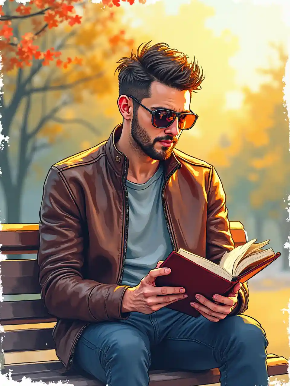 JonathanLukisan cat air digital, seorang pria, jaket kulit futuristik kacamata hitam membaca buku di bangku taman, perpaduan harmonis antara teknologi dan alam. Warna kuning orange merah dan biru