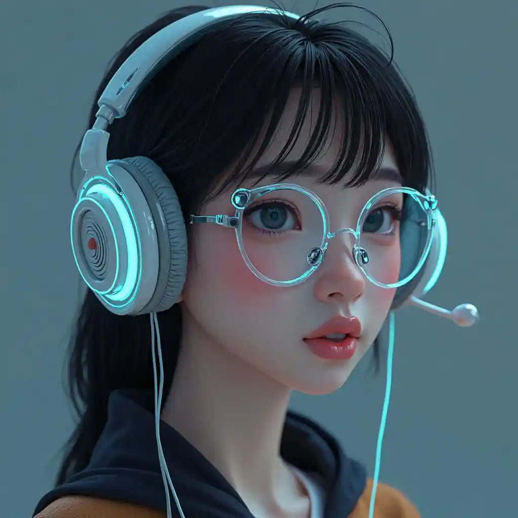 Portrait, oung gadis dengan headphone kaca desain tembus pandang, garis streamline, aksen krom, palet melankolis, (kualitas terbaik, 4K, 8,000, hi