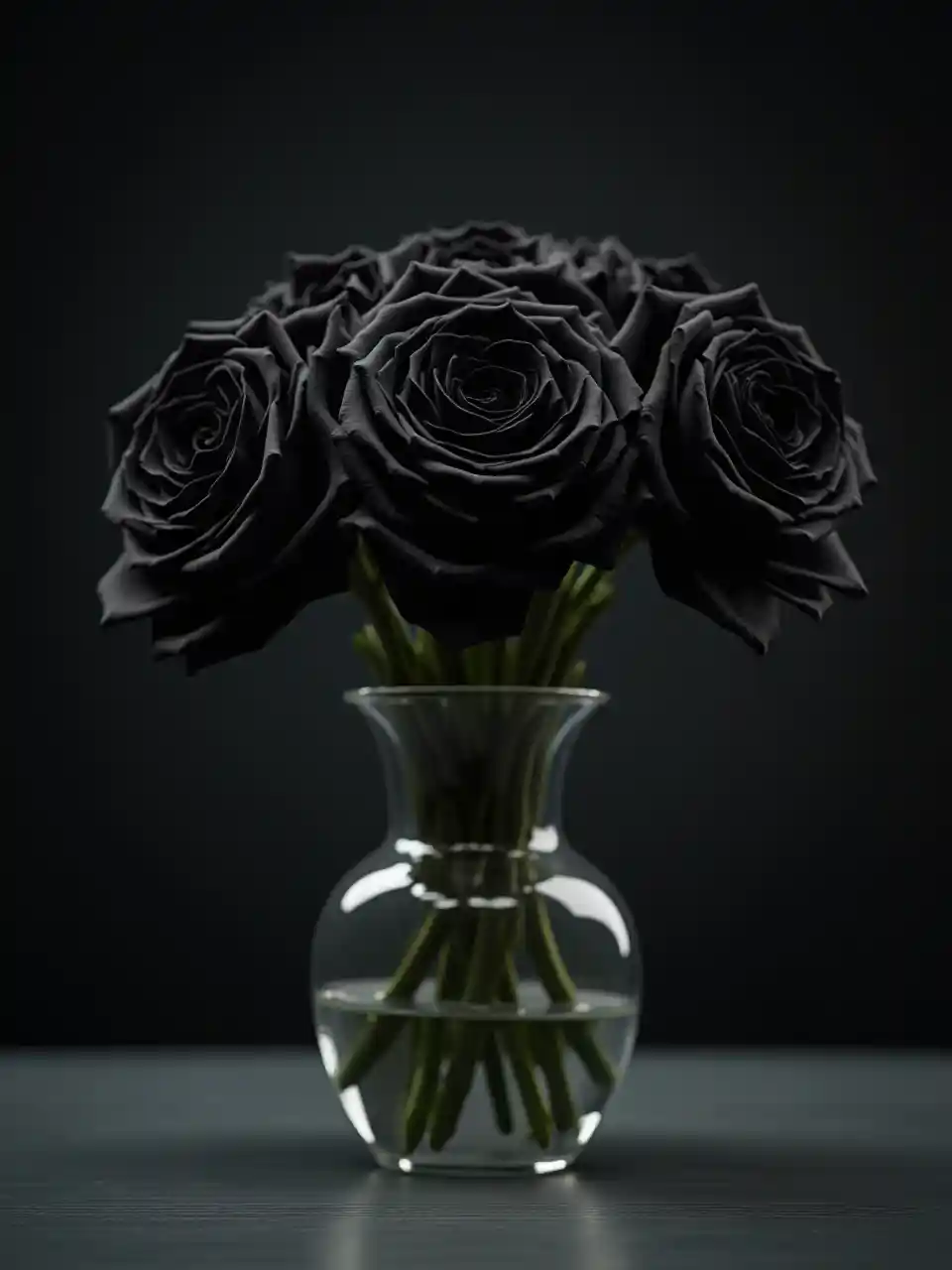 Mawar hitam dalam vas kaca, dengan pencahayaan dramatis