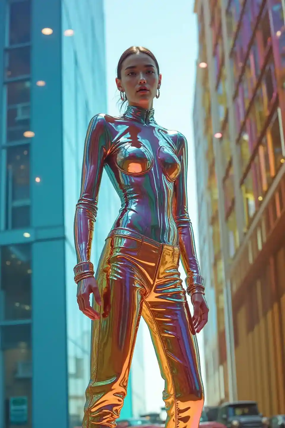 DanielSeorang wanita yang mengenakan baju kaca warna pelangi, celana kaca warna pelangi, dan lengan tangan berwarna robot, berdiri di antara sebuah bangunan yang sangat tinggi yang terbuat dari kaca, Ai