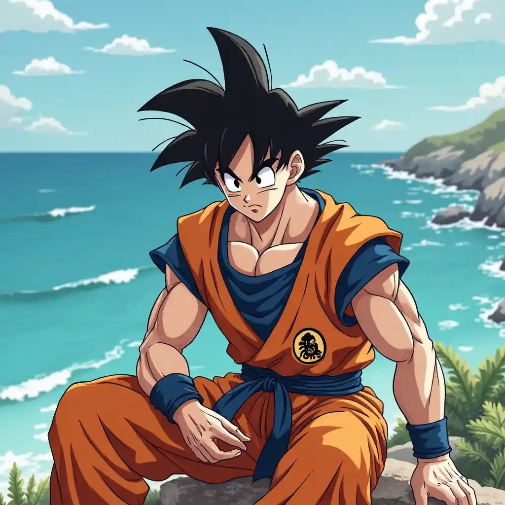 Crea una imagen realista de Goku,el protagonista de Dragon Ball。Goku es un hombre de complesi ó n atl é tica,con un f í sico musculoso y una altura de 1,75 metros。Tiene el pelo negro y corto,con una raya en el medio,y ojos marrones。Su piel es de color bronceado。Respeta su traje caracteristico,kimono naranjo con la insignia de la tortuga。Debe estar sentado mirando el mar de espalda。
