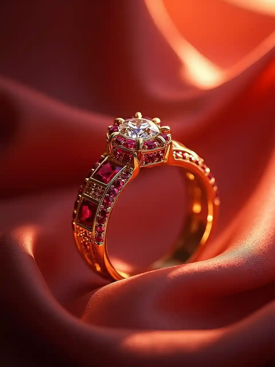 Ciptakan gambar iklan yang menawan dari cincin kawin emas tradisional, berkilauan dengan polesan bercahaya dan reflektif yang harmonis. Cincin ini, dengan berlian terang di tengahnya, menunjukkan detail pengerjaan yang paling halus. Di sekitar berlian, rubi merah yang kaya berkilau seperti bara, membawa kehangatan dan vitalitas ke komposisi keseluruhan. Bayangkan potongan halus ini dengan latar belakang dramatis, dengan cahaya lembut dan halus yang bermandikan cincin, menyoroti lekukan mewah dan detail yang rumit. Tambahkan sentuhan kain sutra subur ke latar belakang untuk meningkatkan nuansa keanggunan. Gunakan skema warna yang dinamis untuk memunculkan kemegahan emas dan kecemerlangan batu permata yang berapi-api untuk menciptakan karya seni iklan yang menakjubkan dan eye-catching.
