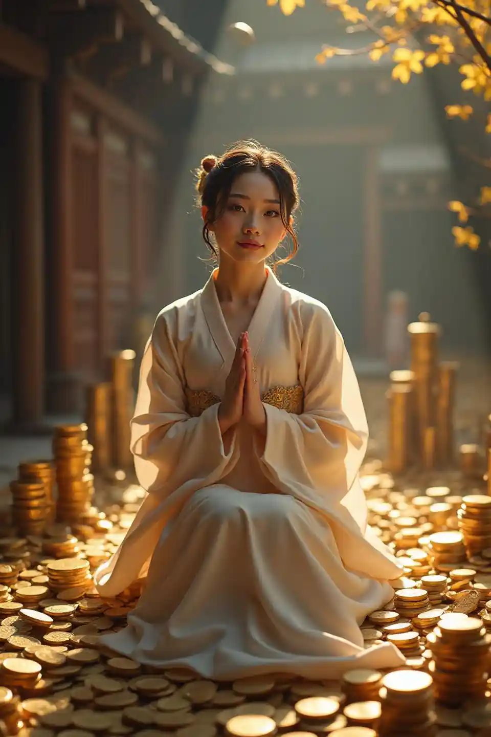 DavidA woman wearing a gorgeous hanbok sits on the gold coins piled up like mountains on the floor,Put your hands together and throw a gold coin into the sky, Captur