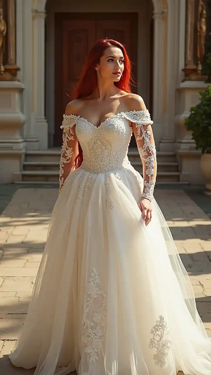 Seorang binaragawan drag queen Turki berusia 35 tahun berotot cantik, dengan busom besar dan rambut merah tua, berpose di sekitar kurva dalam gaun pengantin berbulu gading, lengan panjang tanpa bahu dan detail renda dengan garis leher sweetheart.