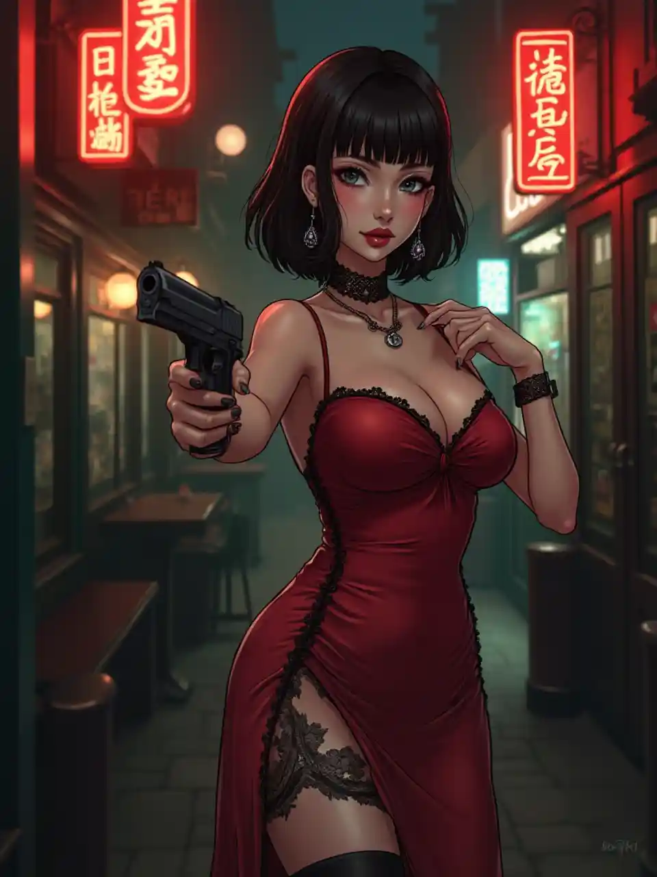 Ilustrasi anime yang hidup, seorang wanita gothic yang menggoda dan seksi dalam gaun merah seksi, belahan dada, jahitan samping di atas pinggang, tirai panggul, stoking renda hitam, anting-anting, kalung, choker, bob lurus hitam, poni, eyeshadow gelap, bibir merah, dada tengah, tatapan langsung sensual, bar Chinatown di era hitam 40-an, papan nama neon, menunjuk penonton dengan pistol, dari samping, malam, gelap, pencahayaan terarah, bokeh, pencahayaan satu sisi, Holland Corner
